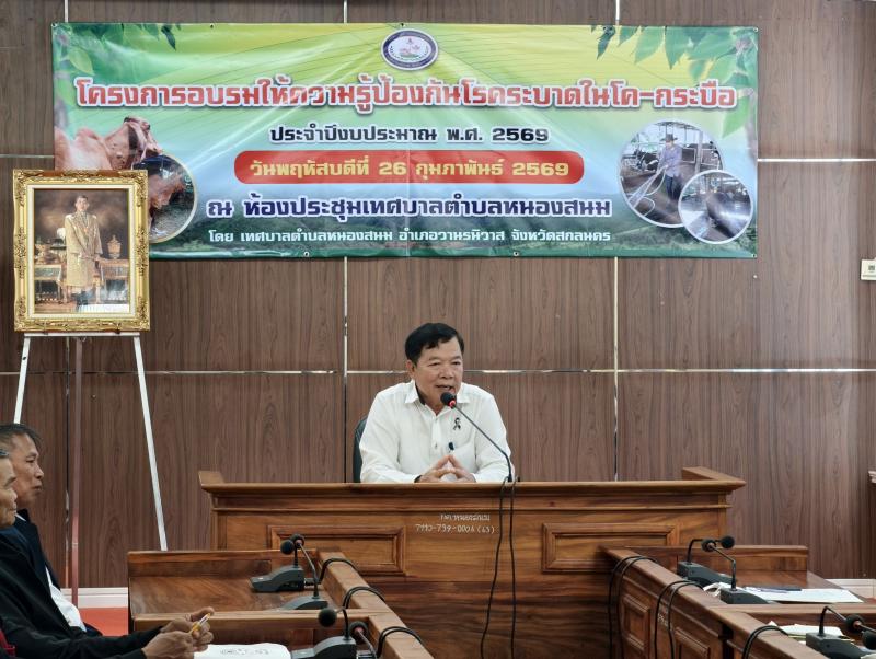 description วันพฤหัสบดีที่ 26 กุมภาพันธ์ 2569 เวลา 09.30 น.งานส่งเสริมการเกษตร สำนักปลัดเทศบาล ได้ดำเนินโครงการอบรมให้ความรู้ป้องกันโรคระบาดในโค-กระบือ ประจำปีงบประมาณ พ.ศ.2569 ณ ห้องประชุมสภาเทศบาลตำบลหนองสนม โดยได้รับเกียรติจาก ท่านเสริมสุข สุพล นายกเทศมนตรีตำบลหนองสนม เป็นประธานในพิธีเปิดโครงการฯ และได้ความอนุเคราะห์วิทยากรจากสำนักงานปศุสัตว์อำเภอวานรนิวาส มีเกษตรกรผู้เข้าร่วมโครงการฯ จำนวน 50 คน ครับ person สำนักปลัด
