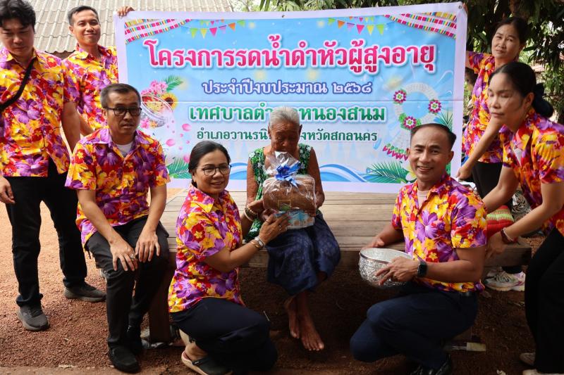 description วันพฤหัสบดีที่ 10 เมษายน 2568 นางสาวพยอม ชิณวงษ์ ปลัดเทศบาล ปฏิบัติหน้าที่ นายกเทศมนตรีตำบลหนองสนม พร้อมเจ้าหน้าที่เทศบาลตำบลหนองสนม ได้จัดทำโครงการรดน้ำดำหัวผู้สูงอายุ ประจำปีงบประมาณ 2568 เพื่อขอพรผู้อายุและมอบขวัญแก่ผู้สูงอายุในพื้นที่ตำบลหนองสนม person สำนักปลัด