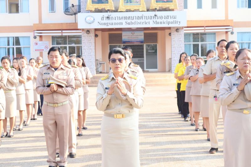 description เวลา 08.00 น. นางดอกจันทร์ วงค์มา นายกเทศมนตรีตำบลหนองสนม พร้อมคณะผู้บริหาร พนักงานเทศบาล พนักงานจ้าง จ้างเหมาบริการ ทำกิจกรรมเข้าแถวเคารพธงชาติ สวดมนต์ไหว้พระ หลังเสร็จกิจกรรม นายกเทศมนตรีตำบลหนองสนม แจ้งข้อปฏิบัติราชการ และมอบนโยบายในการปฏิบัติงานให้กับบุคลากร ณ บริเวณหน้าเสาธง สำนักงานเทศบาลตำบลหนองสนม person สำนักปลัด