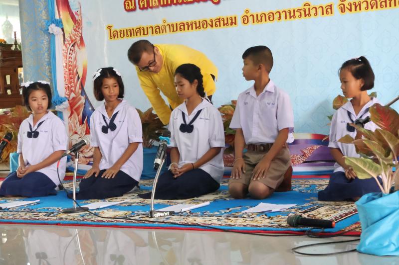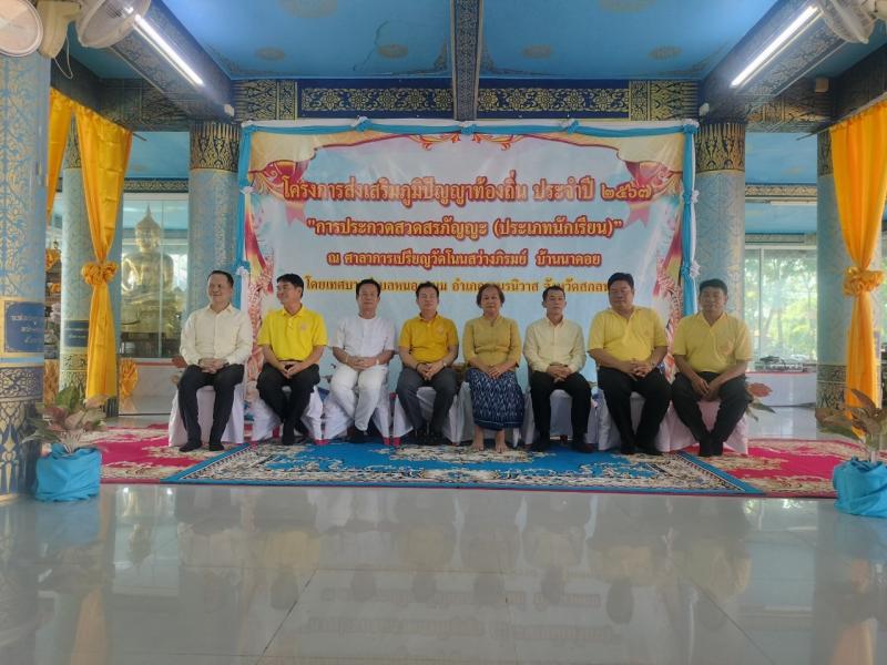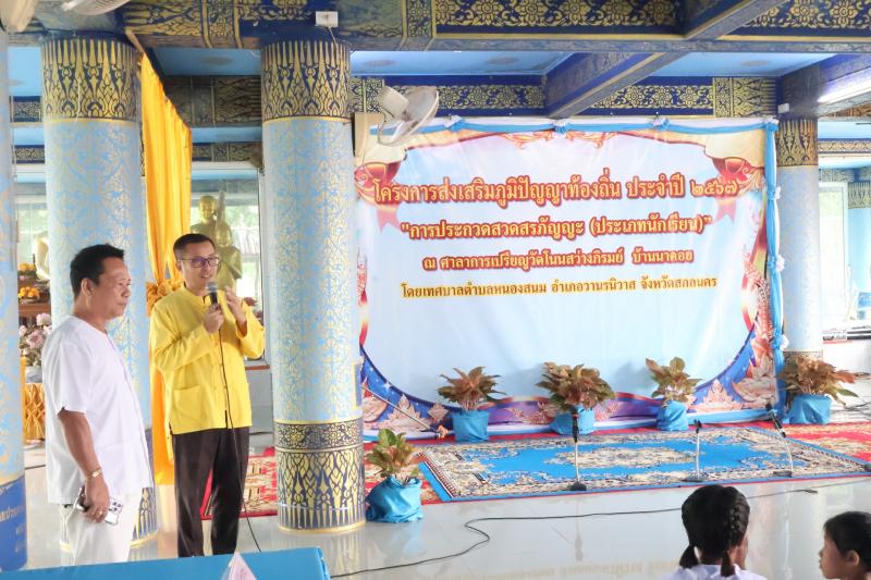 description เวลา 08.30 น. พระครูปัญญาธรรมรังสี เจ้าคณะอำเภอวานรนิวาส เป็นประธานในพิธีเปิดโครงการส่งเสริมภูมิปัญญาท้องถิ่น ประจำปี 2567 “การประกวดสรภัญญะ (ประเภทนักเรียน)” ณ.ศาลาการเปรียญ วัดโนนสว่างภิรมย์ บ้านนาคอย หมูที่ 13 ต.หนองสนม อ.วานรนิวาส จ. สกลนคร นำโดย นางดอกจันทร์ วงค์มา นายกเทศมนตรีตำบลหนองสนม พร้อมคณะผู้บริหาร เจ้าหน้าที่ สมาชิกสภา ผู้อำนวยการโรงเรียน ครู และนักเรียน ทั้ง 12 โรงเรียน ในเขตพื้นที่ตำบลหนองสนม เข้าร่วมโครงการในครั้งนี้ โดยมีวัตถุประสงค์เพื่อเป็นการอนุรักษ์ภูมิปัญญาท้องถิ่น ส่งเสริม สนับสนุน ให้ประชาชน เด็กและเยาวชน ตระหนักถึงคุณค่าของศิลปะที่มีความสำคัญต่อการดำรงชีวิตในวิถีทางของท้องถิ่นตลอดจนการนำแนวคิดไปประยุกต์ใช้ในชีวิตประจำวันต่อไป และ เวลา 11.00 น. นางดอกจันทร์ วงค์มา นายกเทศมนตรีตำบลหนองสนม พร้อมคณะผู้บริหาร ได้ถวายเพลแด่พระสงฆ์ ณ วัดโนนสว่างภิรมย์ person สำนักปลัด