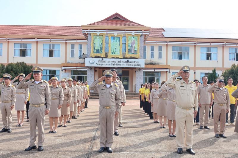 description เวลา 08.30 น. นายเสริมสุข สุพล นายกเทศมนตรีตำบลหนองสนม พร้อมคณะผู้บริหาร พนักงานเทศบาล พนักงานจ้าง จ้างเหมาบริการ ทำกิจกรรมเข้าแถวเคารพธงชาติ สวดมนต์ ไหว้พระ หลังเสร็จกิจกรรม นายกเทศมนตรีตำบลหนองสนม แจ้งข้อปฏิบัติราชการและมอบนโยบาย ในการปฏิบัติงานให้กับบุคลากร ณ บริเวณหน้าเสาธงสำนักงานเทศบาลตำบลหนองสนม person สำนักปลัด