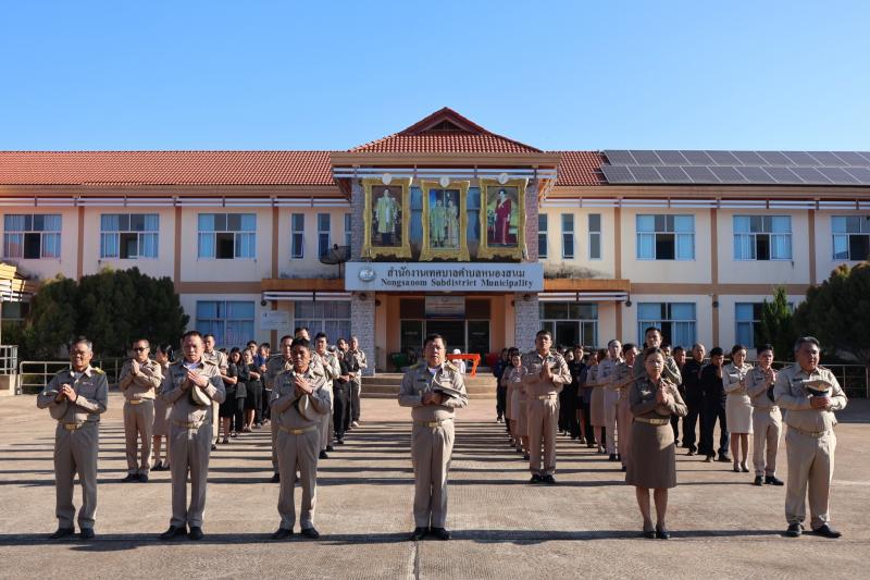 description วันจันทร์ที่ 5 มกราคม 2569เวลา 08.30 น. นายเสริมสุข สุพล นายกเทศมนตรีตำบลหนองสนม พร้อมคณะผู้บริหาร สมาชิกสภาเทศบาลพนักงานเทศบาล พนักงานจ้าง จ้างเหมาบริการ ทำกิจกรรมเข้าแถวเคารพธงชาติ สวดมนต์ ไหว้พระ หลังเสร็จกิจกรรม นายกเทศมนตรีตำบลหนองสนม แจ้งข้อปฏิบัติราชการและมอบนโยบาย ในการปฏิบัติงานให้กับบุคลากร ณ บริเวณหน้าเสาธงสำนักงานเทศบาลตำบลหนองสนม person สำนักปลัด