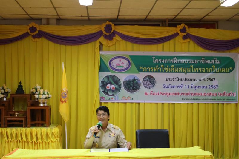 description เวลา 08.30 น. นางดอกจันทร์ วงค์มา นายกเทศมนตรีตำบลหนองสนม เป็นประธานเปิดโครงการฝึกอบรมอาชีพเสริม"การทำไข่เค็มสุมนไพรจากใบเตย" ประจำปีงบประมาณ พ.ศ. 2567 ณ ห้องประชุมเทศบาลตำบลหนองสนม โดยมีวัตถุประสงค์เพื่อส่งเสริมให้ประชาชน ในเขตเทศบาลตำบลหนองสนม ได้รับความรู้ในด้านการพัฒนาศักยภาพคุณภาพชีวิตคนในชุมชน การแปรรูปการถนอมอาหาร สร้างความรู้ และทักษะด้านอาชีพ สร้างโอกาสและทางเลือกในการประกอบอาชีพ เพื่อช่วยลดปัญหาการว่างงาน ทำให้ประชาชนในเขตเทศบาลตำบล หนองสนม มีคุณภาพชีวิตที่ดีขึ้นได้ person สำนักปลัด