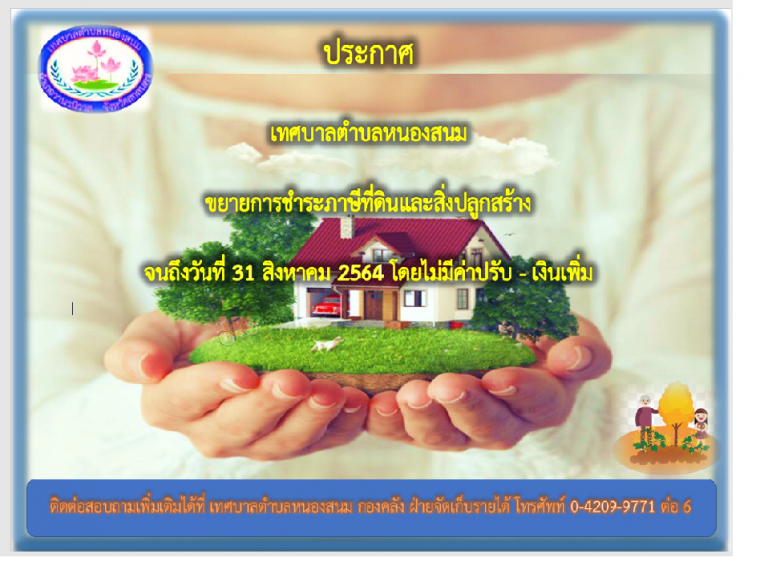 ประกาศ เทศบาลตำบลหนองสนม ขอขยายเวลาชำระภาษีที่ดินและสิ่งปลูกสร้าง และการงดเบี้ยปรับ เงินเพิ่ม