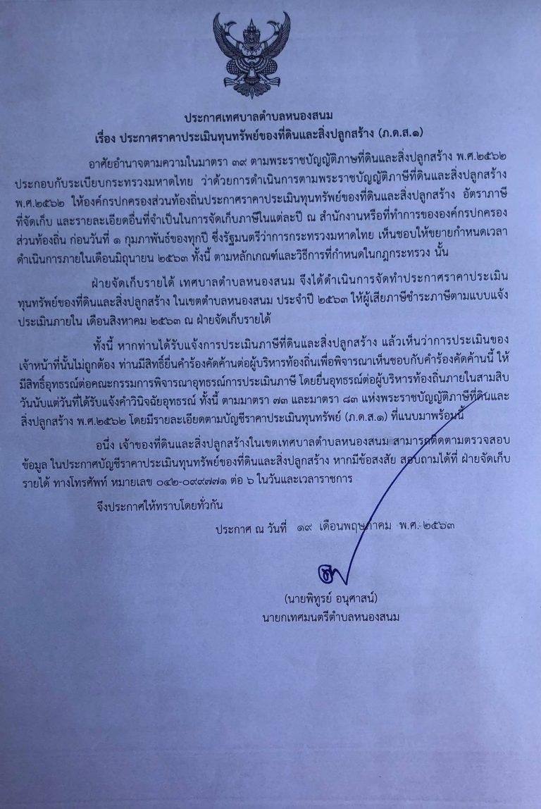 เทศบาลตำบลหนองสนม ประกาศราคาประเมินทุนทรัพย์ของที่ดินและสิ่งปลูกสร้าง (ภ.ด.ส.1)