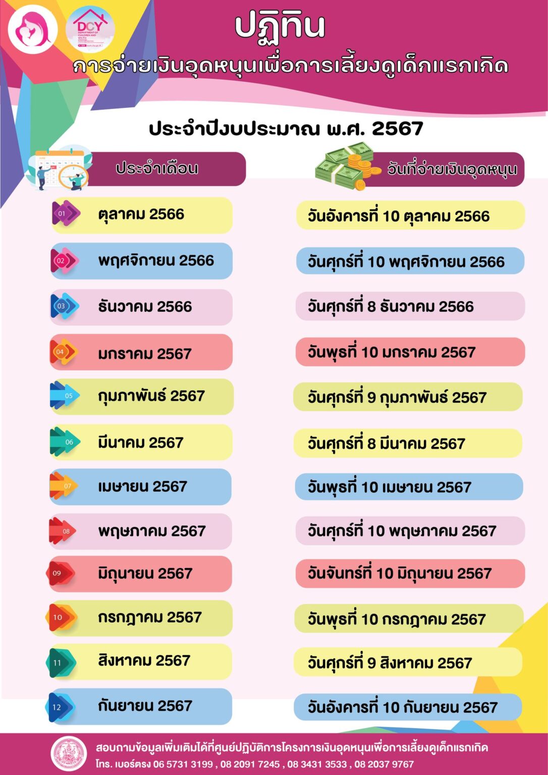 ประชาสัมพันธ์ปฎิทินการจ่ายเงินอุดหนุนเพื่อการเลี้ยงดูเด็กแรกเกิด ประจำปี พ.ศ. 2567