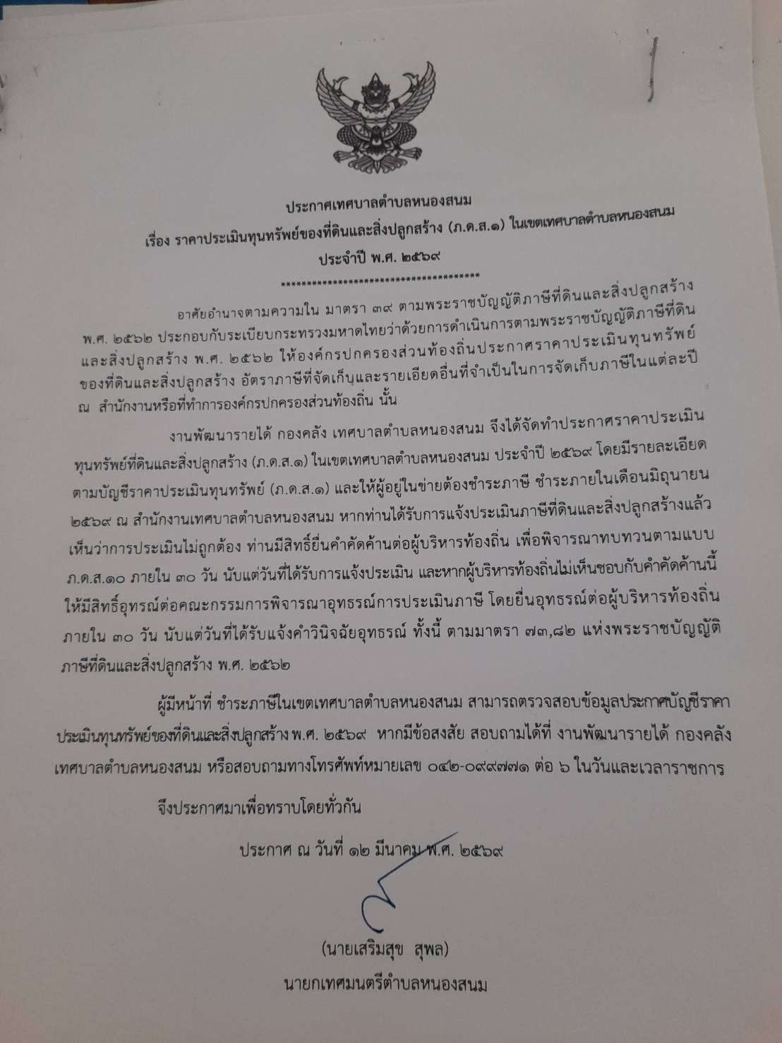 เรื่อง ราคาประเมินทุนทรัพย์ของที่ดินและสิ่งปลูกสร้าง (ภ.ด.ส. 1) ในเขตเทศบาลตำบลหนองสนม ปีงบประมาณ พ.ศ. 2569