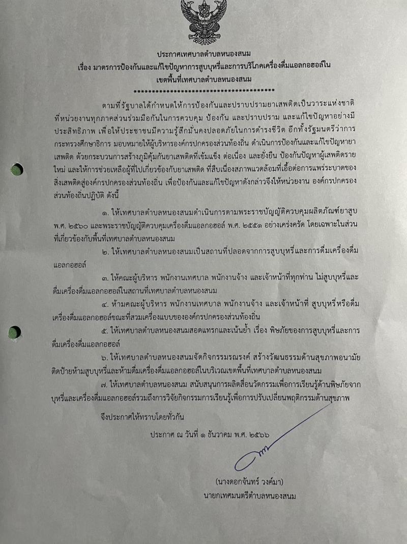 ประกาศเรื่องนโยบายเทศบาลตำบลหนองสนมปลอดปลอดบุหรี่และเครื่องดื่มแอลกอฮอล์