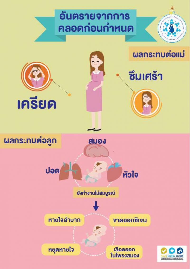 รายละเอียด : การคลอดก่อนกำหนด คือ การคลอดที่เกิดขึ้นก่อนอายุครรภ์ 37 สัปดาห์ ทารกแรกเกิดที่มีอายุครรภ์น้อยกว่า 37 สัปดาห์มีโอกาสเสียชีวิตสูง รวมถึงยังมีโอกาสพบภาวะแทรกซ้อนอื่นๆ เช่น ปอดทำงานไม่ดี มีภาวะเลือดออกในสมอง มีภาวะเลือดออกในลำไส้ ส่งผลให้ทารกมีความพิการในช่วงหลังคลอด บางรายจะมีพัฒนาการล่าช้า หากทารกรายนั้นมีความพิการ ครอบครัว และภาครัฐต้องเสียค่าใช้จ่ายเพื่อการฟื้นฟูสภาพร่างกายและดูแล รักษาต่อเนื่องไม่น้อยกว่า 4 - 5 ปี จากการทำวิจัยที่ได้รับการสนับสนุนจากกองทุนทีปังกรนภัทรบุตร พบว่า ประมาณร้อยละ 50 - 60 ของการคลอดก่อนกำหนดเกิดขึ้นในสตรีตั้งครรภ์ที่ไม่มีโรค หรือ ภาวะแทรกซ้อน ขณะตั้งครรภ์ บางคนเกิดจากพฤติกรรมของสตรีตั้งครรภ์ก่อให้เกิดภาวะเจ็บครรภ์ก่อนกำหนด เนื่องจากสตรีตั้งครรภ์เหล่านั้น ยังขาดความรู้เรื่องการป้องกันตนเองให้ปลอดภัยจากภาวะคลอด ก่อนกำหนด จึงเข้ามารับการรักษาล่าช้าเป็นเหตุให้การยับยั้ง ภาวะเจ็บครรภ์คลอดก่อนกำหนดไม่ประสบผลสำเร็จ