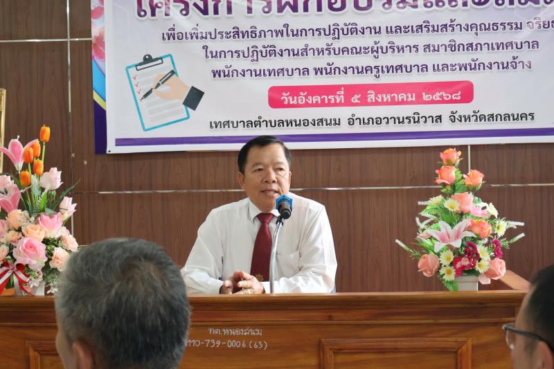 รายละเอียด : เวลา 09.00 น. นายเสริมสุข สุพล นายกเทศมนตรีตำบล หนองสนม เป็นประธานเปิดโครงการฝึกอบรมและสัมมนา เพื่อเพิ่มประสิทธิภาพในการปฏิบัติงานและเสริมสร้างคุณธรรมจริยธรรมในการปฏิบัติงานสำหรับคณะผู้บริหาร สมาชิกสภาเทศบาล พนักงานเทศบาล พนักงานครูเทศบาล และพนักงานจ้าง ณ ห้องประชุมสภาเทศบาลตำบลหนองสนม