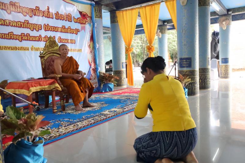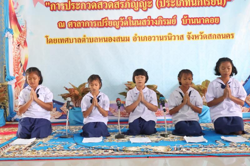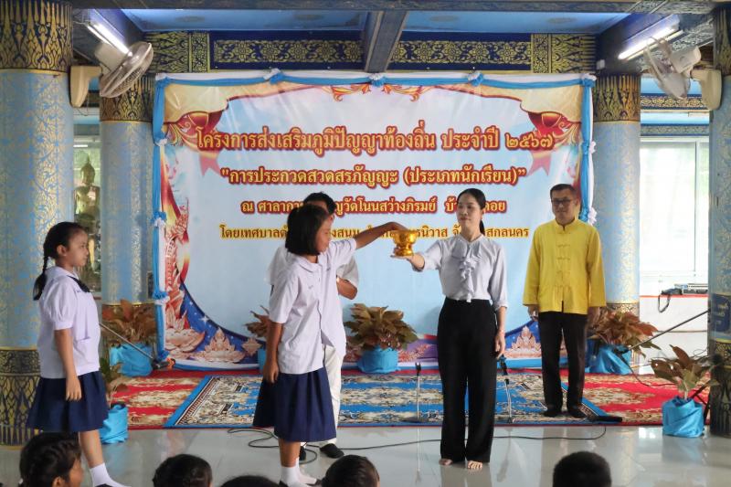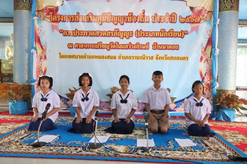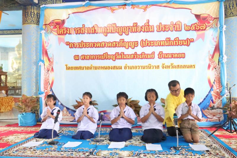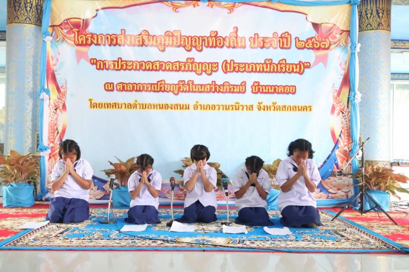 รายละเอียด : เวลา 08.30 น. พระครูปัญญาธรรมรังสี เจ้าคณะอำเภอวานรนิวาส เป็นประธานในพิธีเปิดโครงการส่งเสริมภูมิปัญญาท้องถิ่น ประจำปี 2567 “การประกวดสรภัญญะ (ประเภทนักเรียน)” ณ.ศาลาการเปรียญ วัดโนนสว่างภิรมย์ บ้านนาคอย หมูที่ 13 ต.หนองสนม อ.วานรนิวาส จ. สกลนคร นำโดย นางดอกจันทร์ วงค์มา นายกเทศมนตรีตำบลหนองสนม พร้อมคณะผู้บริหาร เจ้าหน้าที่ สมาชิกสภา ผู้อำนวยการโรงเรียน ครู และนักเรียน ทั้ง 12 โรงเรียน ในเขตพื้นที่ตำบลหนองสนม เข้าร่วมโครงการในครั้งนี้ โดยมีวัตถุประสงค์เพื่อเป็นการอนุรักษ์ภูมิปัญญาท้องถิ่น ส่งเสริม สนับสนุน ให้ประชาชน เด็กและเยาวชน ตระหนักถึงคุณค่าของศิลปะที่มีความสำคัญต่อการดำรงชีวิตในวิถีทางของท้องถิ่นตลอดจนการนำแนวคิดไปประยุกต์ใช้ในชีวิตประจำวันต่อไป และ เวลา 11.00 น. นางดอกจันทร์ วงค์มา นายกเทศมนตรีตำบลหนองสนม พร้อมคณะผู้บริหาร ได้ถวายเพลแด่พระสงฆ์ ณ วัดโนนสว่างภิรมย์