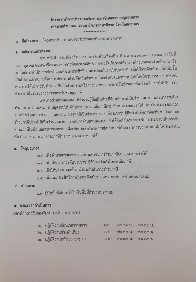 ชื่อเรื่อง : ประกาศ โครงการบริการประชาชนบริการจัดเก็บภาษีป้ายนอกเวลาราชการ แจ้งการปฎิบัติหน้าที่นอกเวลาราชการ กำหนดช่วงเวลาการปฎิบัติงานนอกเวลาราชการ ดังต่อไปนี้ 1 ปฎิบัติงานก่อนเวลาราชการ เวลา 08.00 น. – 08.30 น. 2 ปฎิบัติงานช่วงพักเที่ยง เวลา 12.00 น. – 13.00 น. 3 ปฎบัติงานหลังเวลาราชการ เวลา 16.30 น. – 17.00 น. เริ่มตั้งแต่วันที่ 6 มกราคม – 30 เมษายน 2563