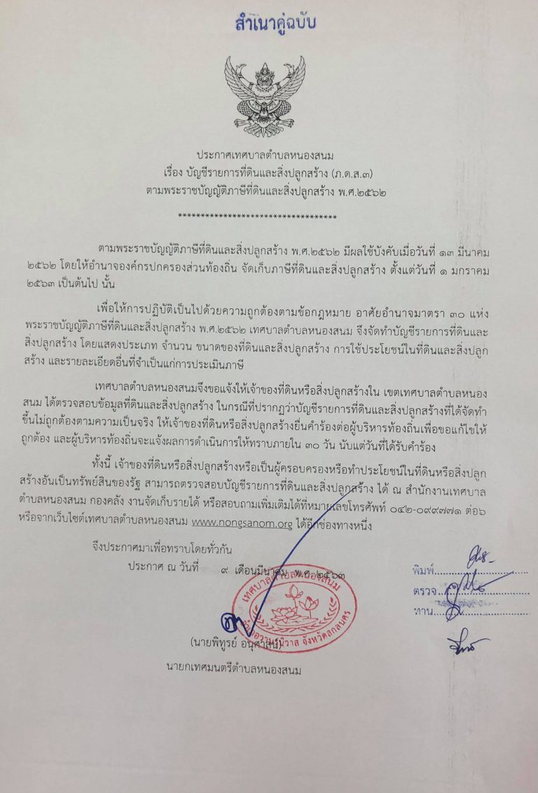 เทศบาลตำบลหนองสนม ประกาศบัญชีรายการที่ดินและสิ่งปลูกสร้าง (ภ.ด.ส.3)